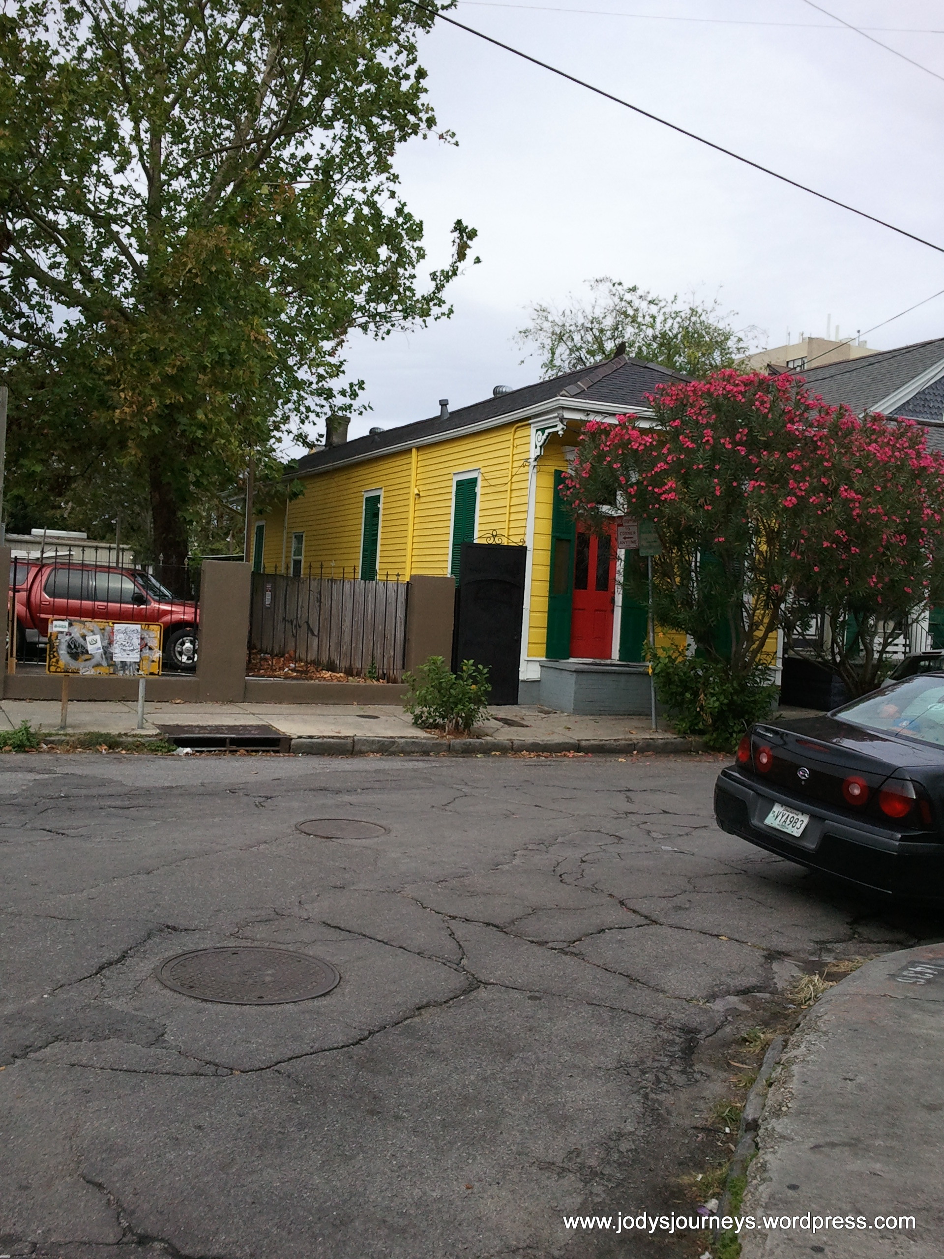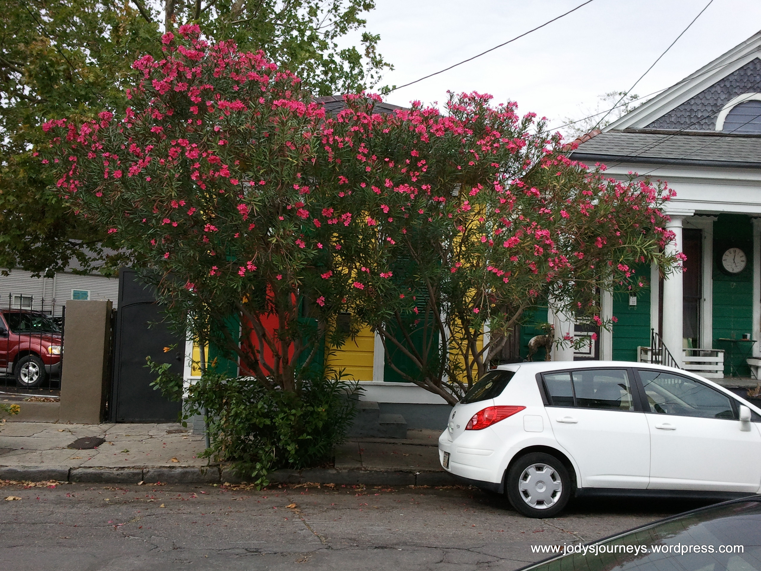 Unfortunately the only house I found of this type had this beautiful shrub in front of it so it is hard to see how small it is, but it is hard to complain about such a beautiful tree. I figured they probably had it there so people like me didn’t take pictures of it and for privacy, but I still took some pictures. It was too colorful and nice to just pass by. The green one next to it was what they call a double shotgun because it is like two of the smaller yellow one.