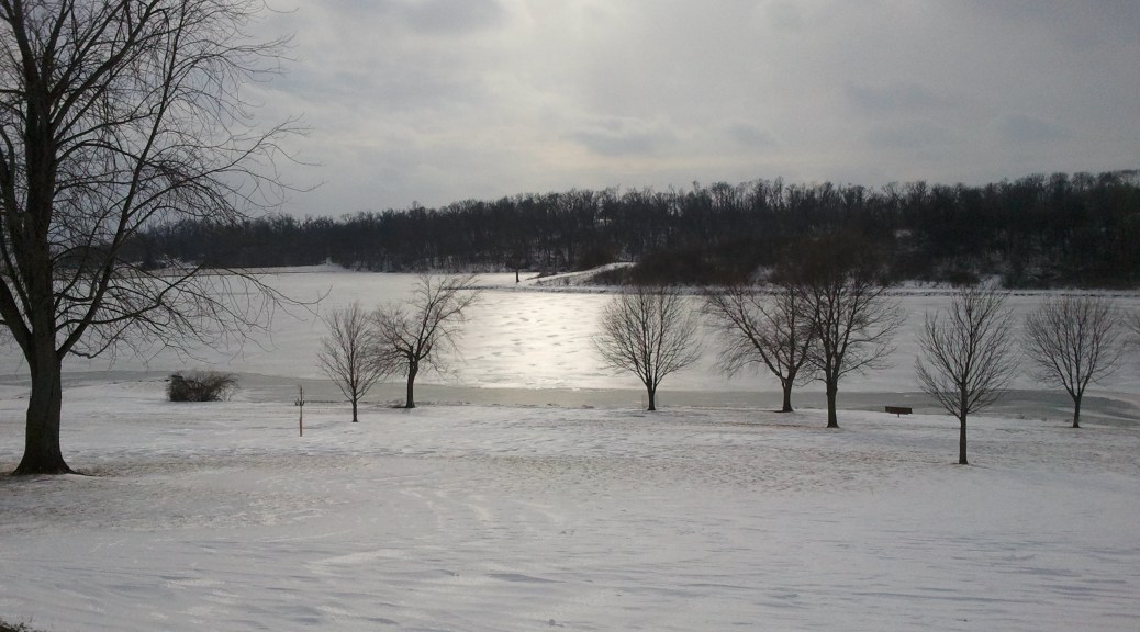 Having reached a mature age, I feel very weird doing it … but I just love to sled! So although my children are grown up and have moved away and I, therefore, have no one to go with, I go by myself and figure no one that sees me will know how old I am because I get so bundled up.  When we get a good snow, the first thing I want to do is go sledding at our country park, Otter Creek.  As a child, some of my best memories are of going sledding on a big hill that was across a very busy highway.  We were not allowed to cross the highway, so we found a huge culvert that we could walk through to get to the other side.  We had to bend over and it could be gross with rags hanging down, but it was worth it to get to fly down the hill on the other side.  Getting older does have some advantages since now I can drive to any hill I choose and park.  In the above photo those black spots off in the distance are ice fishing tents.  I plan to cover ice fishing — which my family (except me) is avid about — again this year in later blogs.  They are off ice fishing as I write this so hopefully they will get some good pictures I can share.