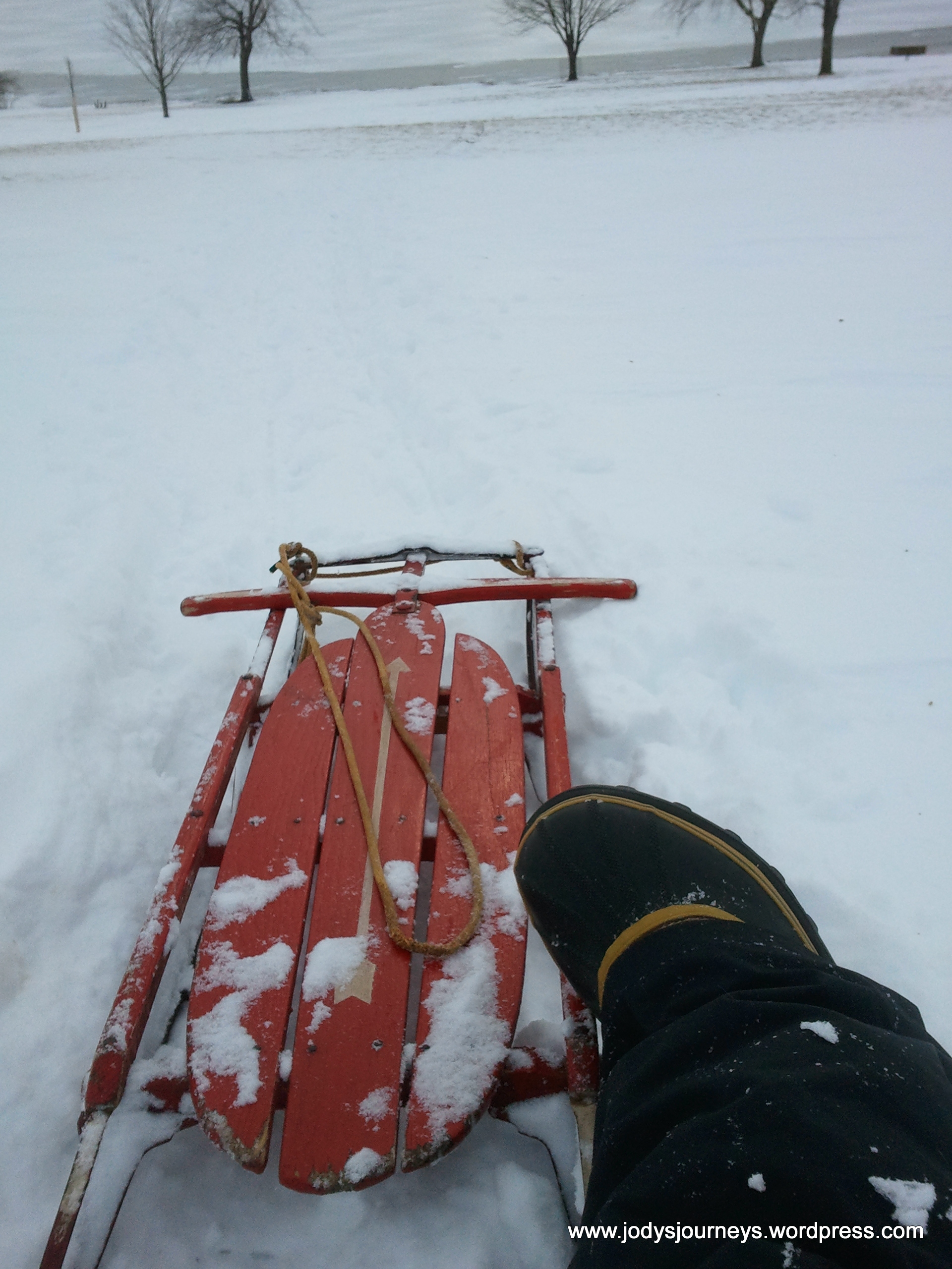 Throughout life whenever I see a grassy hill with very few trees, if any at all, the first thought that goes through my mind is “Wow, what a great sledding hill!”  So when hubby and I would be out fishing at the county lake in the summer, I would always look at the hill and think how much fun it would be sledding that hill.  As I got out more and became healthier, I was able to take the kids to that hill and many times hubby would be ice fishing  while we’d be sledding.    Unfortunately for me you can see that they keep adding trees to my sledding hill.  However with a runner sled that you can steer this doesn’t pose such a problem.