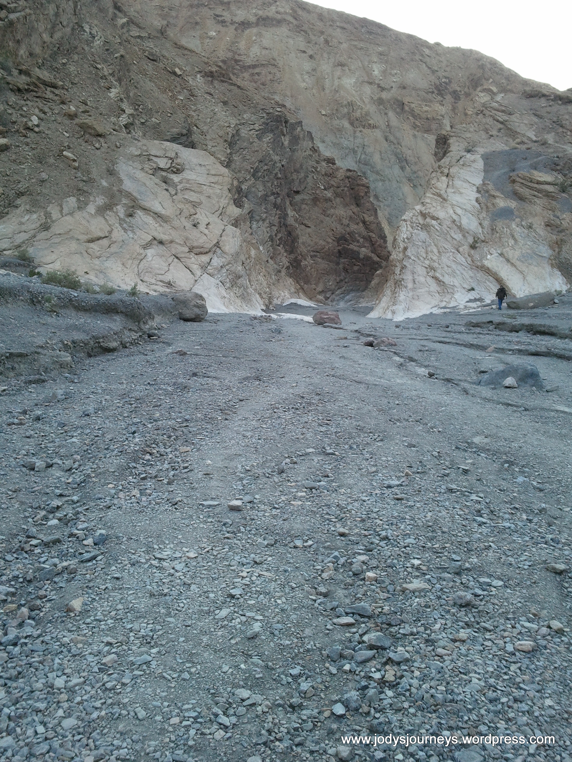 We spent quite a bit of time with my rock-hound hubby sifting through all the loose stones. I just enjoyed the magnificence of the scenery and the overall sense of awe. I wish I could put that in better words but words fail me. I tried to capture how small I felt and in the presence of greatness by making hubby walk back down to the entrance of the narrow canyon (which we still had to go back down anyway) to help get some perspective.  He was walking over to inspect a trail that was an option to getting back down where we could have gone up and over, I guess, but instead we chose to go back into the caynon to the left of him.