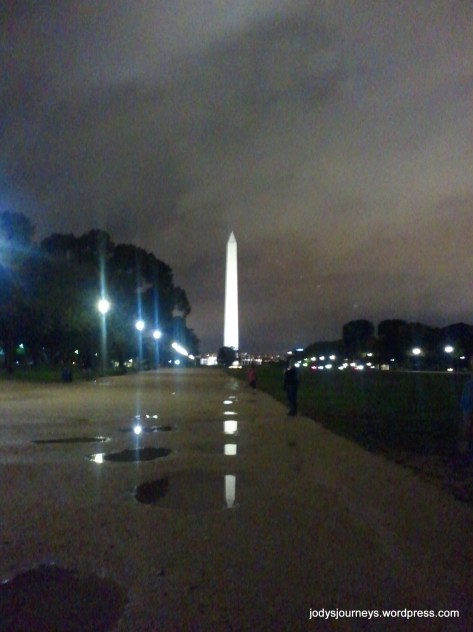 See how the puddles reflected the Washington monument?  The only night we could all go together it, of course, stormed!  A small group of brave souls decided we just couldn’t pass up the opportunity so off we went to brave the elements.  I was really close to backing out as it had been storming like crazy with tornado watches and warnings, but we waited it out and eventually it stopped for a while.  Below is my favorite photo, but we were in such a hurry to see everything before it started to rain again, that we didn’t stop long to take pictures.