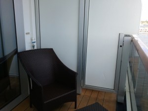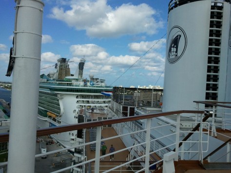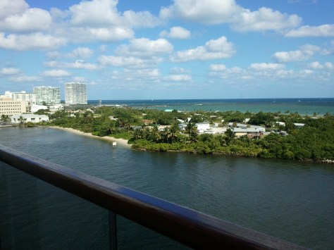 Our friends had a balcony room so we enjoyed going up to their room and sitting on their balcony, especially as we pulled out of Ft. Lauderdale, but as you can kind of tell from the picture, it was a bit of a squeeze with four of us.  It definitely felt rougher up there, though, than in the exact middle of the ship where we were.
