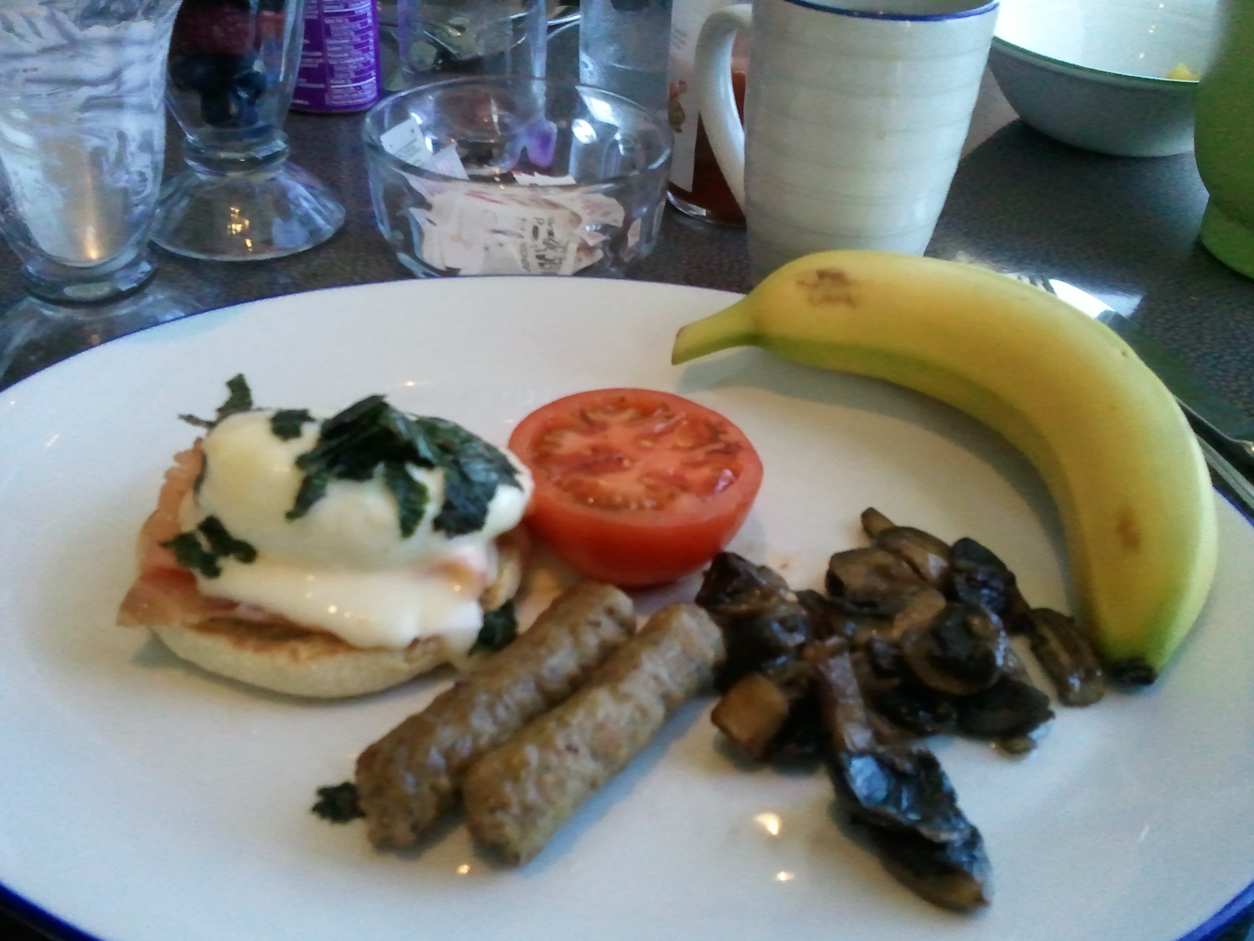 The food was fantastic!  Everything was so flavorful, and it was pretty easy to eat healthy if you wanted.  It was also easy to pig out if you wanted to do that.  Hubby always got full.  We usually ate breakfast and lunch at the buffet on the Lido deck, and then went to the more formal dinners in the dining room each evening.  I didn’t take pictures of the evening fancy food, I guess because I was too busy eating?  Anyway, the picture is of one breakfast I had. We managed to also try out the sliced pizza that was always available for snacks and the burgers and fries at the grill for lunch a couple of times.  I wasn’t that sold on the pizza, but the salmon burger was very good!!  One night we spent the $20 more and ate at the premium restaurant Pinnacle Grill where hubby and friends had big steaks and I had lamb.  I had gone to the cooking show where the chef prepared the soup that is served in the Pinnacle Grill so enjoyed having that and will enjoy it again when I make it at home!