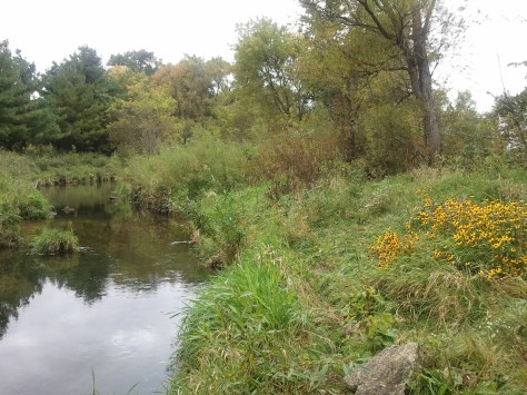 Hubby and I had planned on going camping again Sat. night, but when the forecast changed and it stayed cold, I said no way so we decided to leave early Sunday morning for a trout fishing adventure.  It was a cool morning but the sun started to peep out as we got closer.  It takes a couple of hours to get to the trout streams in Iowa because they are clustered mainly around the NE area of Iowa.  We managed to catch our limit at the first place we stopped which was Joy Springs, a small county park by Strawberry Point, Iowa.  I really had forgotten how much fun fall trout fishing is.  The trout are so active and really splash around when you catch them.  It’s also just beautiful scenery to enjoy as you tramp up and down the bank.