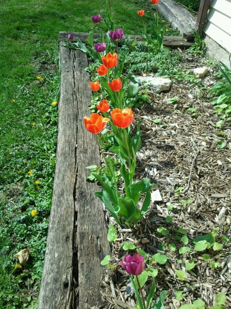 They just make me want to smile! We had so many more planted, but the rabbits eat them off right as they come up! Below is my favorite shot of our regular tulips that hubby planted last fall. I definitely plan to plant more bulbs for next year.
