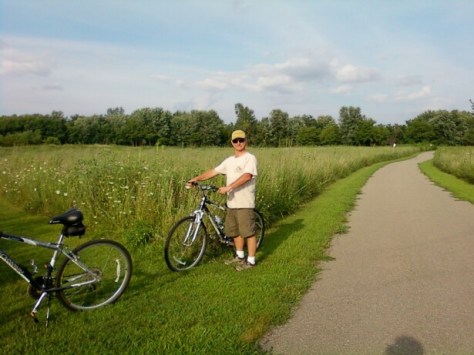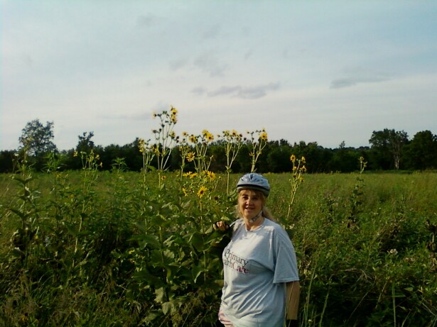 However, last week my husband and I went the other way which I believe is west. 🙂 The bike trail goes by the football fields where my sons played football as 4th graders and always makes me smile remembering those cold, early days out watching them. Then it follows a stream and eventually ends at the nature center.  In the next picture I was trying to show the height of some of the flowers.