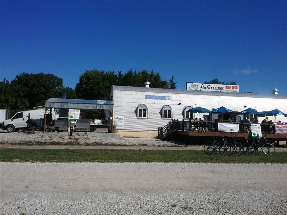 As you can see in the above picture, there is a lounge and outside grill (to the left of the lounge) at the trailhead in Madrid. The trail runs right in front of it.  You can see how popular it is by the number of bikes parked outside here and in the below picture. Make sure you go inside the Flat Tire Lounge and see the decor.  I found the cement bar that has a bit of mosaic in it very unique. Parking is all along the trail here.